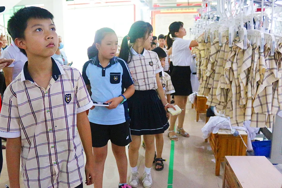 小記者們?cè)谏a(chǎn)中心工作人員的引領(lǐng)下,先后參觀了黨建中心、吊掛車(chē)間、裁剪車(chē)間、線下針織車(chē)間、全國(guó)學(xué)生裝文化展示中心、企業(yè)展示中心等。小記者們圍著解說(shuō)員爭(zhēng)先恐后地提問(wèn),認(rèn)真地聆聽(tīng)講解、仔細(xì)地觀察、記錄。解說(shuō)員耐心地向小記者們?cè)敿?xì)介紹服裝的每一道工序,小記者們第一次這么近距離接近服裝生產(chǎn)線,一雙雙好奇的眼睛滿是欣喜,親眼見(jiàn)證了一件學(xué)生裝各個(gè)環(huán)節(jié)生產(chǎn)的過(guò)程,了解全國(guó)各地一些學(xué)生裝文件知識(shí)。