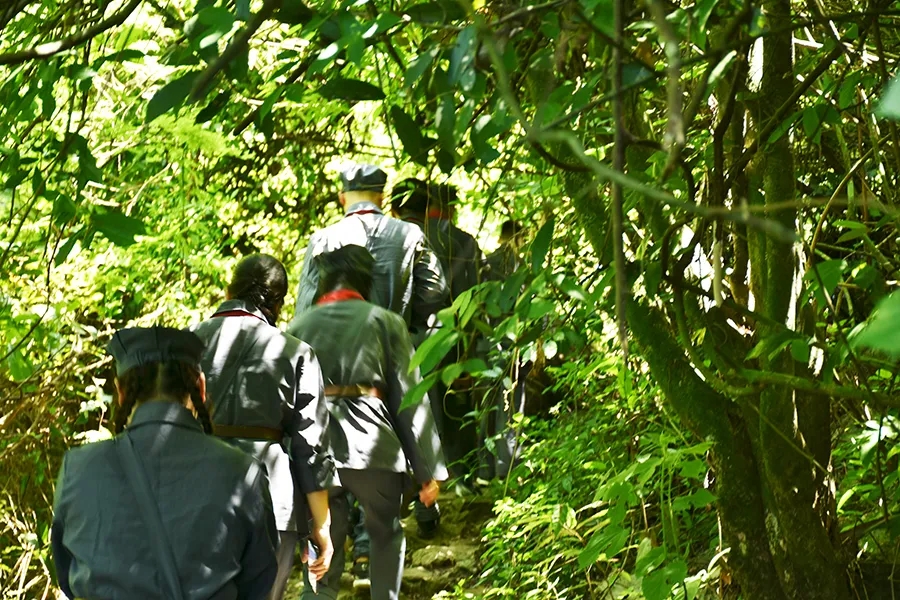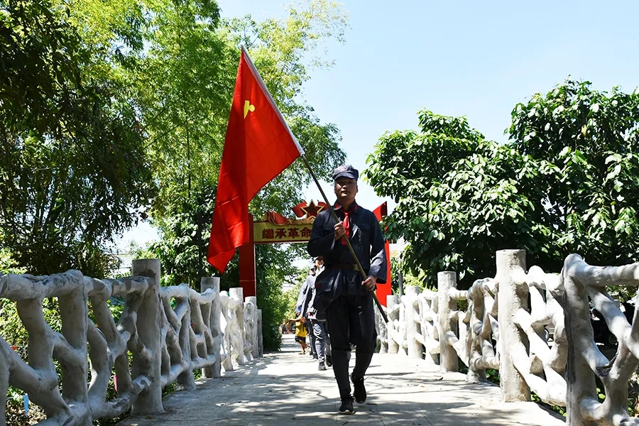 當(dāng)天,參加活動(dòng)黨員干部懷揣著敬慕與感恩之心,穿上紅軍服戴上紅軍帽,模擬紅八軍建制,編隊(duì)整訓(xùn),沿著革命先輩的足跡,徒步重走一次紅軍路,舉行簡單的授旗儀式后,學(xué)員們高舉旗幟,從水隴徒步至甫茶,追憶紅軍革命精神,傳承紅色精神!