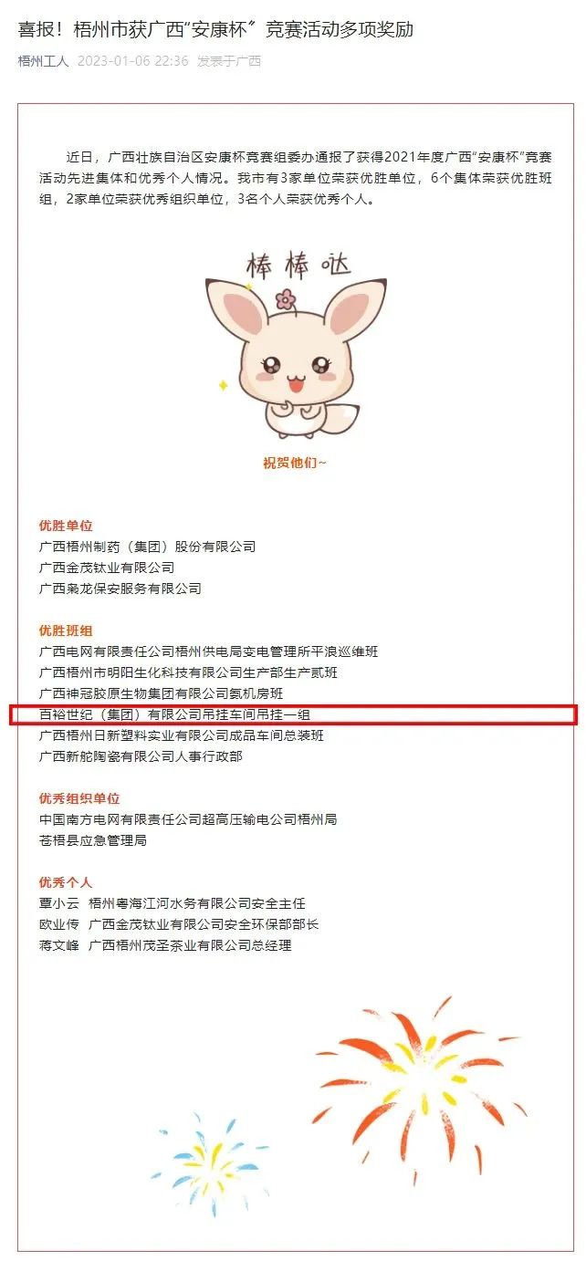 1月06日,廣西壯族自治區(qū)安康杯競(jìng)賽組委辦通報(bào)了獲得2021年度廣西“安康杯”競(jìng)賽活動(dòng)先進(jìn)集體和優(yōu)秀個(gè)人情況。百裕世紀(jì)(集團(tuán))有限公司吊掛車間吊掛一組榮獲“優(yōu)勝班組”稱號(hào)。