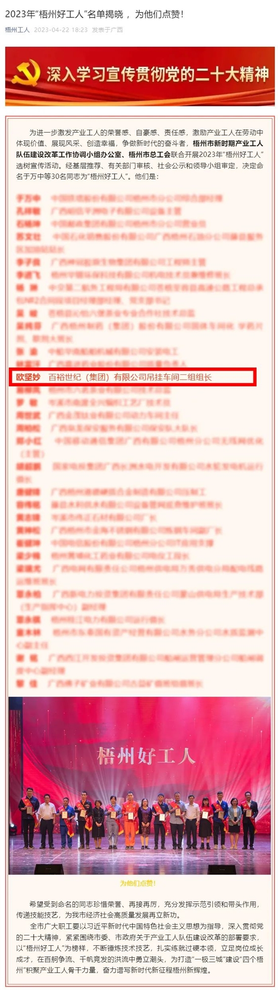 為進一步激發(fā)產(chǎn)業(yè)工人的榮譽感、自豪感、責(zé)任感,激勵產(chǎn)業(yè)工人在勞動中體現(xiàn)價值、展現(xiàn)風(fēng)采、創(chuàng)造幸福,爭做新時代的奮斗者,梧州市新時期產(chǎn)業(yè)工人隊伍建設(shè)改革工作協(xié)調(diào)小組辦公室、梧州市總工會聯(lián)合開展2023年“梧州好工人”選樹宣傳活動。經(jīng)基層推薦、有關(guān)部門審核、社會公示和領(lǐng)導(dǎo)小組審定,最終選樹了30名“梧州好工人”。其中,百裕世紀(集團)有限公司吊掛車間二組組長歐堅妙榜上有名。