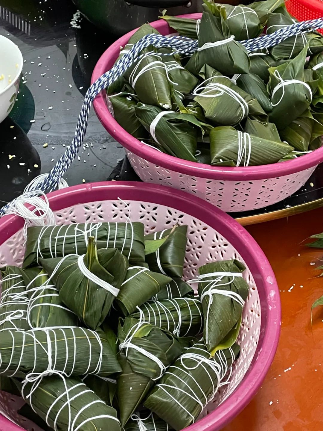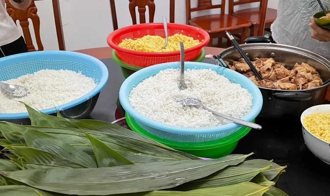 現(xiàn)場(chǎng)準(zhǔn)備了豐富多樣的餡料:翠綠的粽葉、飽滿的糯米和綠豆、還有肥瘦相間的豬肉、香甜的海鮮餡料、香菇等。