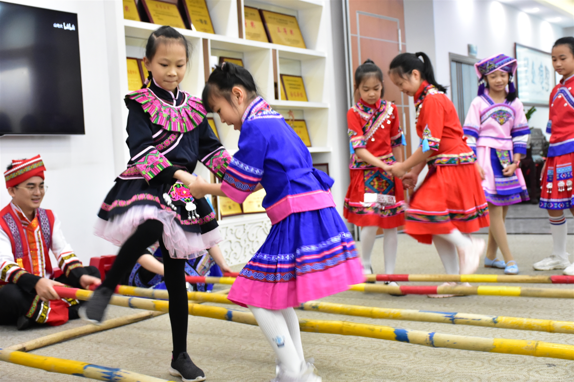 跳進(jìn)去,跳出來(lái);小竹竿,動(dòng)起來(lái)......伴隨著竹竿清脆的敲擊聲,孩子們依次跳過(guò)竹竿陣,體驗(yàn)節(jié)日的歡樂(lè)及感受壯鄉(xiāng)的民族風(fēng)情。