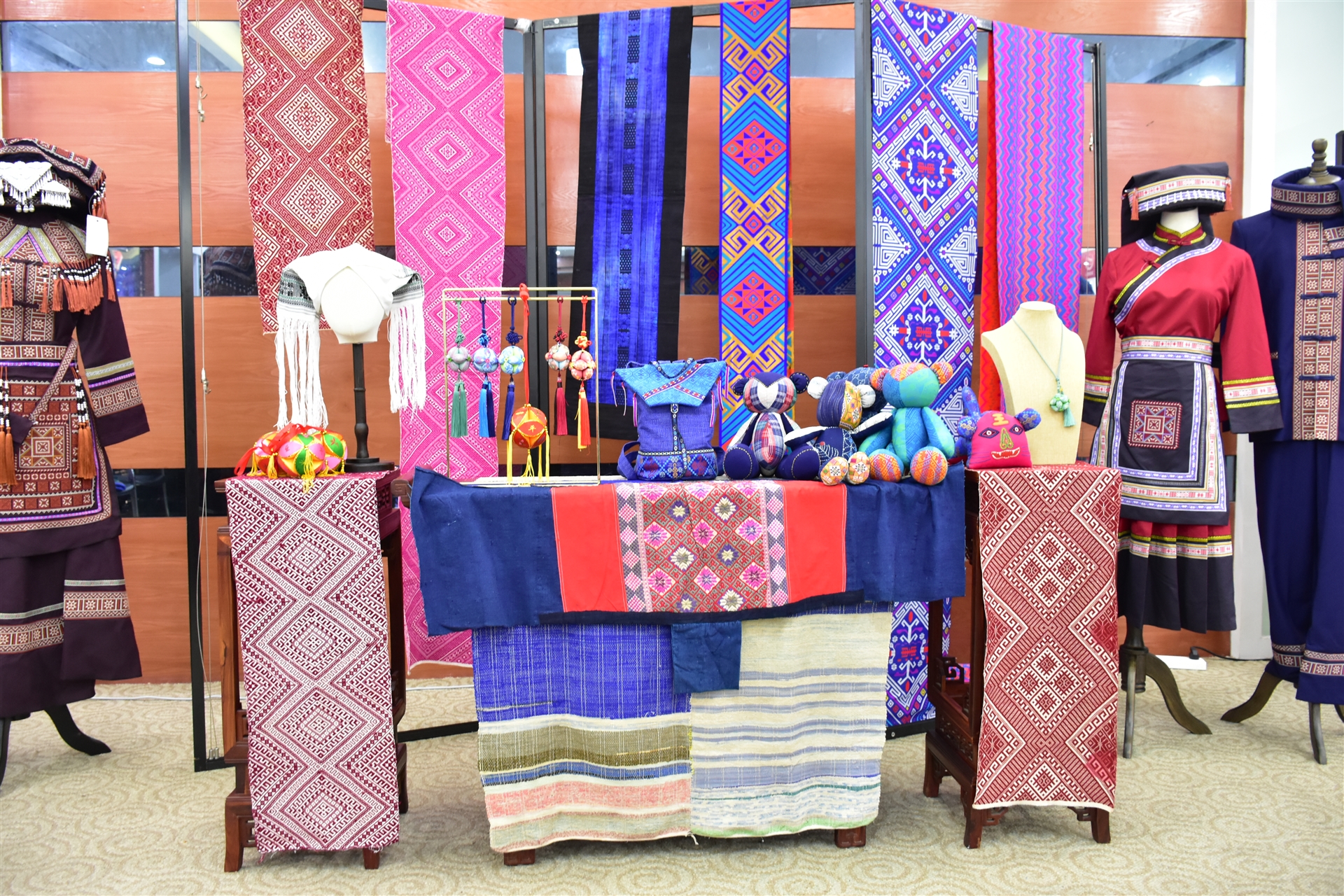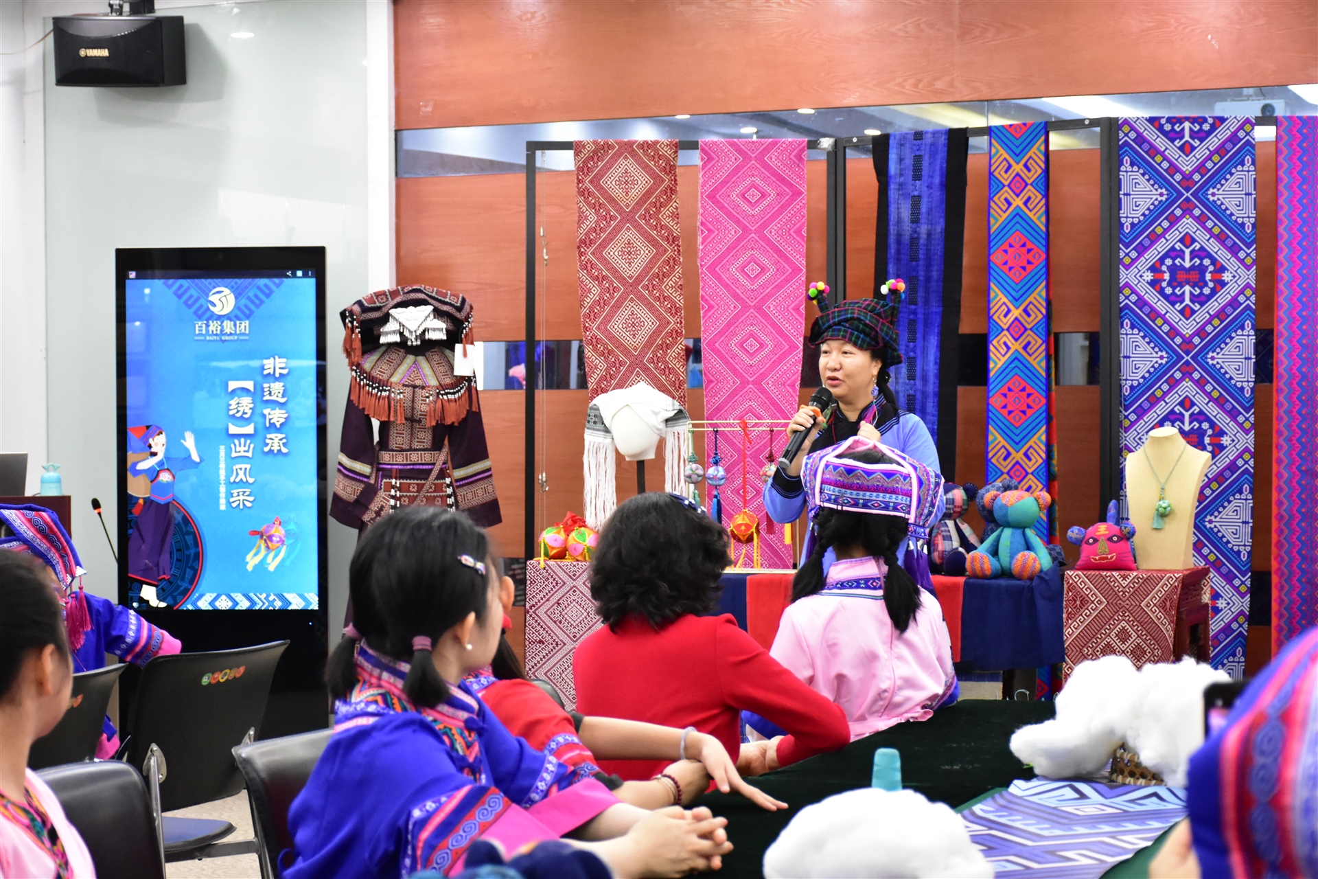 隨后,非遺老師向大家介紹了融入民族元素的校服,具有民族特色的手工藝品以及制作繡球的流程、技巧。